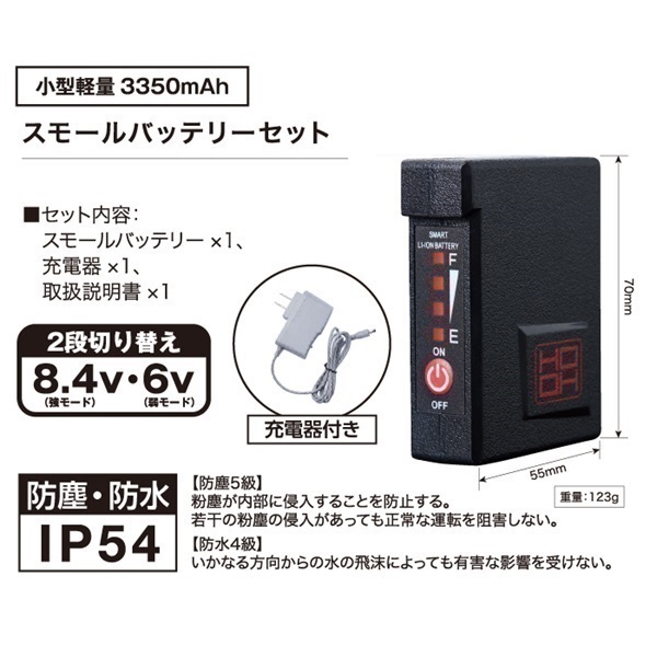 ●機能:2段切り替え(8.4V・6V)、粉塵・防水(IP54)