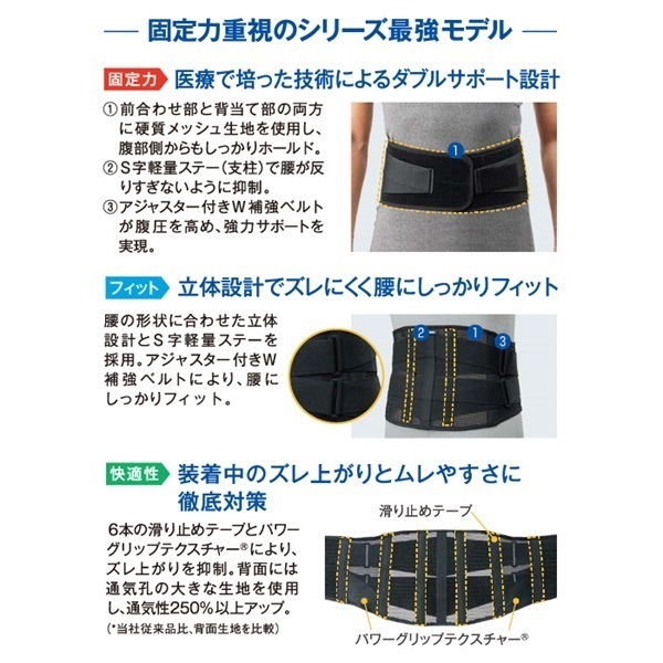 【シリーズ最強の固定力①】:背部に内蔵された、当社医療用製品にも採用されているS字軽量ステー(支柱)が腰の反りすぎを抑制。また従来品よりもさらに強力になった2本のアジャスター付きW補強ベルトで、腰を強力にサポートします。