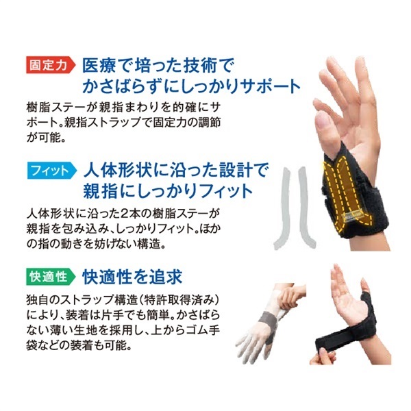 【固定力】:サポータに内蔵された樹脂ステーが親指まわりを的確にサポートします。親指ストラップで固定力の調節も可能。