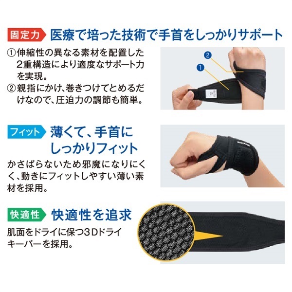 【しっかりとした固定力】:伸縮性の異なる素材を配置した2重構造により、適度な固定力を実現。