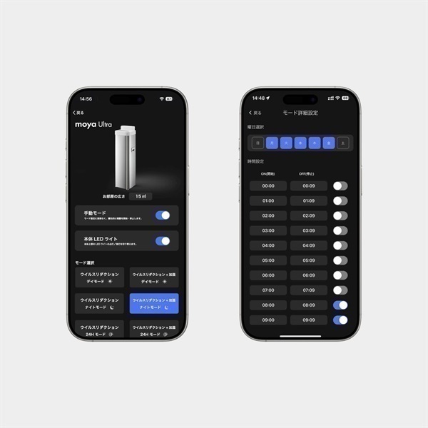 Bluetooth接続に対応し、専用のスマートフォンアプリから操作が可能です。お部屋の広さを設定し、モードを選ぶだけで、自動的に計算され、その空間に最適化された運転がスタート。さらに、曜日や時間ごとのスケジュール運転にも対応しています。