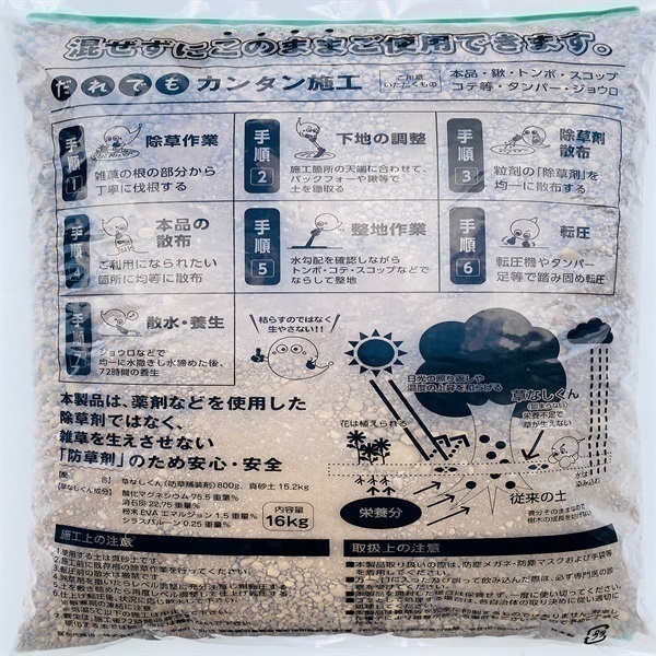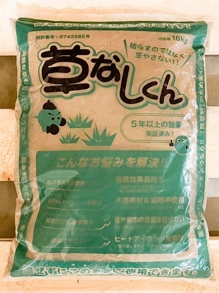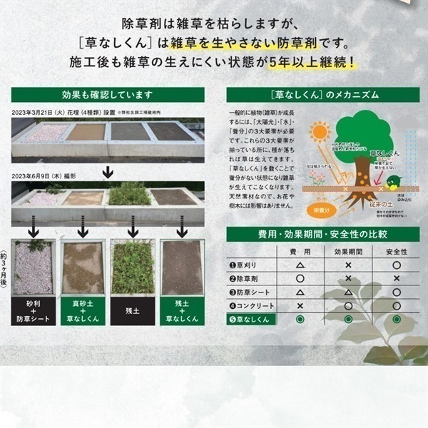 草なしくんとは、従来の除草剤「草を枯らす」ものではなく雑草を成長させない・生やさない状態にする事を目的とした特許取得済の防草商品です。海水生まれの天然素材で薬剤を使用していないため、人にも環境にも優しい、安心安全な商品です。