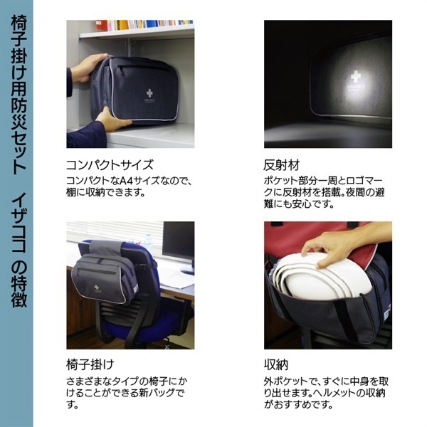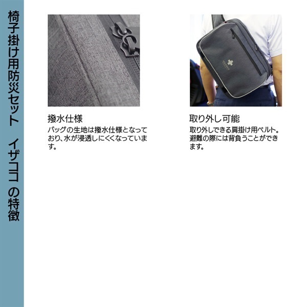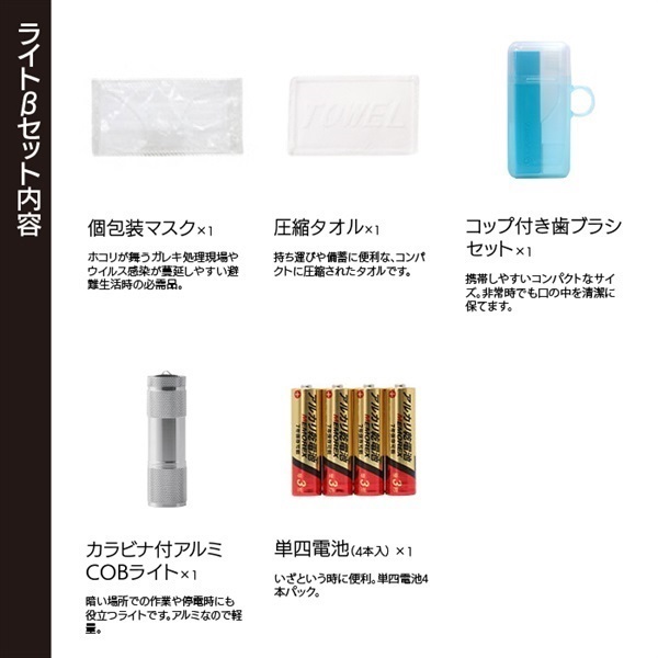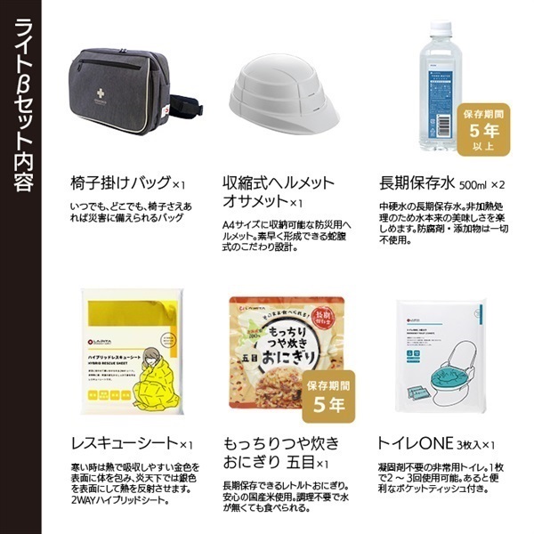 椅子掛けバッグ×1、収縮式ヘルメット オサメット×1、長期保存水 500ml×2、もっちりつや炊きおにぎり(五目)×1、レスキューシート×1、トイレONE 3枚入×1、個包装マスク×1、圧縮タオル×1、コップ付き歯ブラシセット×1、カラビナ付アルミCOBライト×1、単四電池(4本パック)×1