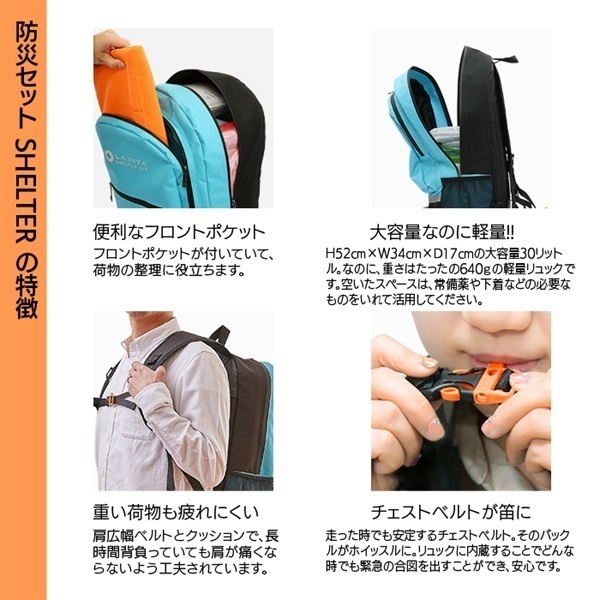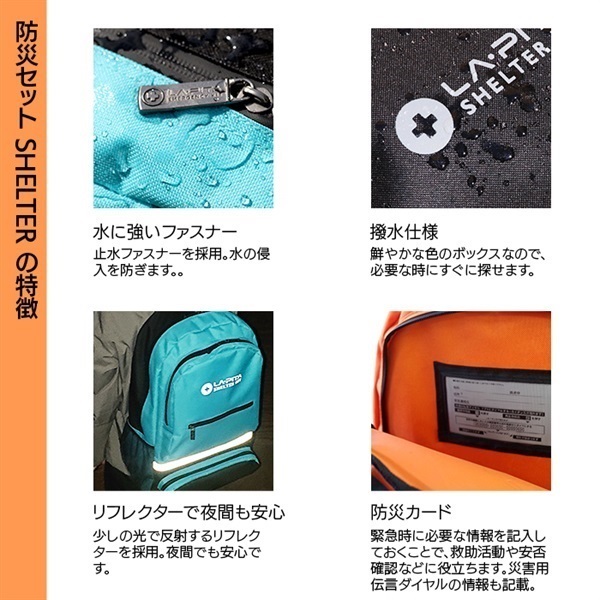 あらゆる本番環境を想定し、テストを繰り返しようやく製品化された、防災士監修 防災セットSHELTER(シェルター)。一般的な防災セットより機能性を追求したSHELTERシリーズは、30リットルの大容量サイズ。セット品を入れた状態でも衣服やタオル等を追加するスペースがあり、重くなっても背負いやすいように太めのショルダーベルトを使用しています。また、リュックにはSHELTERのロゴを含めた3つのリフレクターを搭載し、夜間の安全性にも考慮しました。