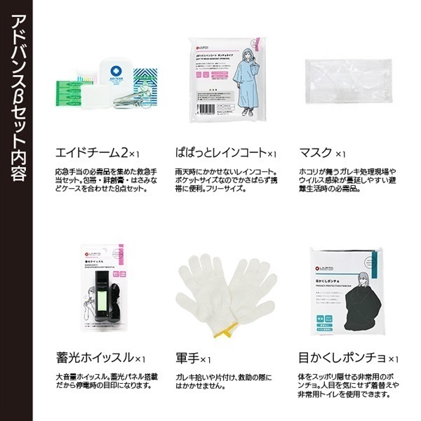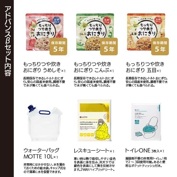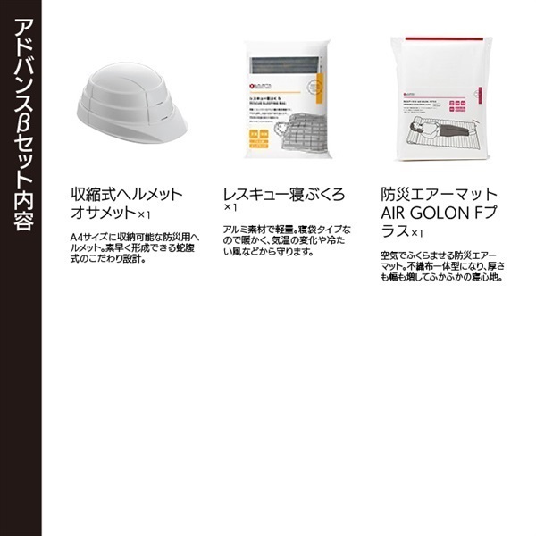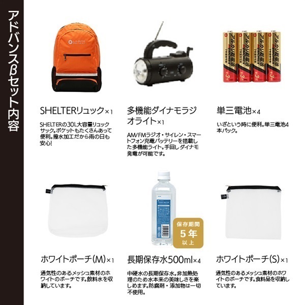 SHELTERリュック×1・多機能ダイナモラジオライト×1・単三電池4パック×1・ホワイトポーチ(M)×1・長期保存水 500ml×4・ホワイトポーチ(S)×1・長期保存 もっちりつや炊きおにぎり(うめしそ/こんぶ/五目)×1・ウォーターバッグ MOTTE 10L×1・レスキューシート×1・トイレONE 3枚入×1・エイドチーム2×1・ぱぱっとレインコート×1・マスク×1・蓄光ホイッスル×1・軍手×1・目かくしポンチョ×1・収縮式ヘルメット オサメット×1・レスキュー寝ぶくろ×1・防災エアーマット AIR GOLON Fプラス×1